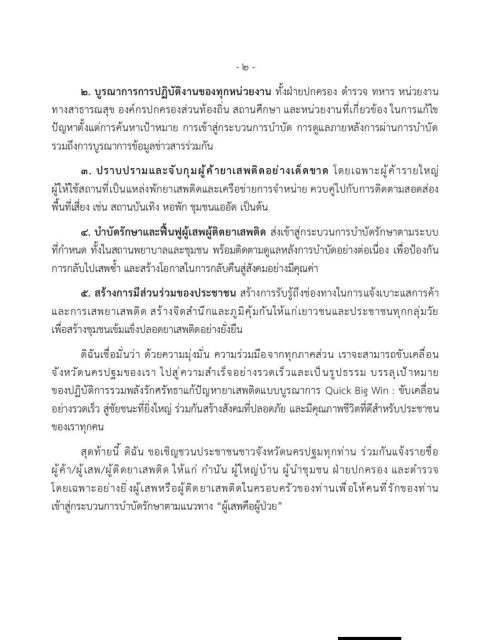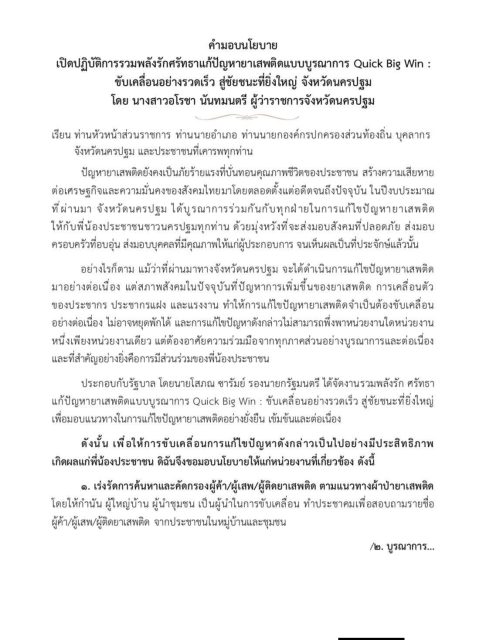 ผู้ว่าราชการจังหวัดนครปฐม มอบนโยบาย “รวมพลังรักศรัทธาแก้ปัญหายาเสพติดแบบบูรณาการ Quick Big Win: ขับเคลื่อนอย่างรวดเร็ว สู่ชัยชนะที่ยิ่งใหญ่ จังหวัดนครปฐม
